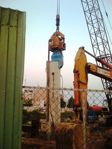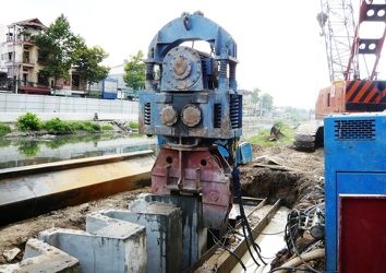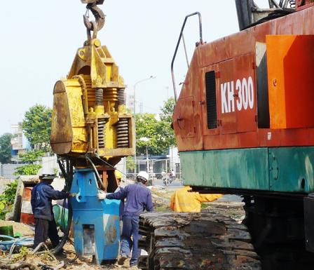 5- Lắp búa rung vào đầu cọc kết hợp với tia nước để hạ cọc đến cao độ thiết kế.
